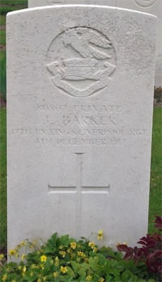 BARKER - Killed in action December 4 1917 (80807) King's Liverpool, Pte JOHN BARKER elder and beloved son of his heartbroken mother, Mrs M. Barker and brother of Samuel and Emma also Maggie and Hannah, his sister in law also his brothers in law. 67 Woodbine Street, Salford.
