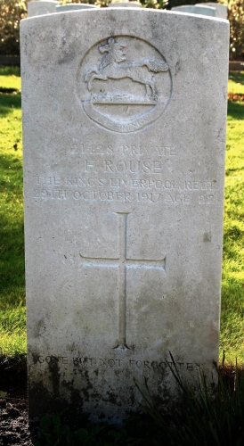 Frank Rouse was born 29th October 1895 at Liverpool and was baptised 3rd November 1895 at Christ Church, C. of E. Church, Everton. He was the son of Frank Rouse and his wife, Jane Anne, (nee Hassett) who were married in 1892 at St Peter's Church, Liverpool.