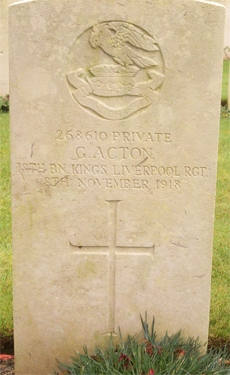 George Acton was born in 1894 in Walton, Liverpool, the son of Thomas Parsons Acton and his wife Martha Jane (nee Stone) who married in 1885. Both were natives of Liverpool. He had a twin sister Mabel, his other siblings were Elizabeth, Louisa, and Alfred (who served in the Royal Navy during the war). Another brother, Thomas died in infancy.