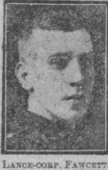 Lance-corporal Arthur Fawcett of the "Pals" who has been killed was the son of Mr. and Mrs. W. Fawcett of 1 Haverstock Street, Fairfield, Liverpool. He was 25 years of age and lived with his parents. He joined the "Pals" in Sept., 1914, and in Dec. last came back from France wounded. After his recovery he returned to the front in March last. He worked for the (Jacob) Dold Packing Co. Mr. Fawcett, who was an employee of the "Daily Post" for many years, has another son on the battlefield."